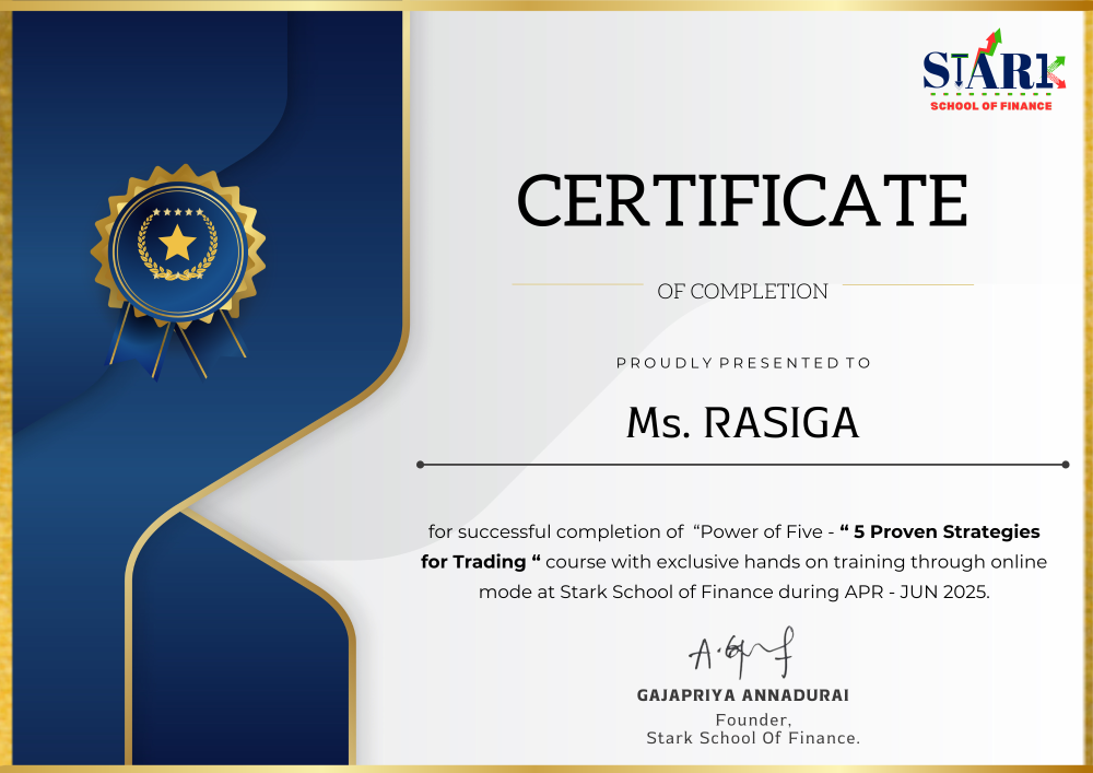 This Certificate is to certify that the student has successfully completed the The Power of Five - 5 Proven Strategies for Trading by Stark School of Finance.